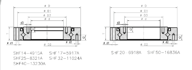 | SHF14-3516A | 38 | 70 | 15.1 | 64 | 64 | --- | 44 | 8-Φ3.5 | 2-M3 | --- | 12-M3 | --- | 5 | 0.5x45° | 5.4 | 7.1 | 0.28 | |